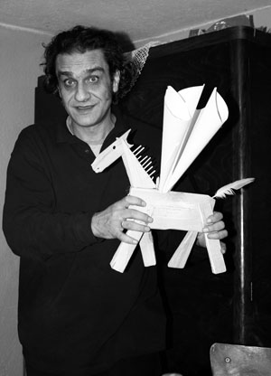 Поетът на своя 50-годишен юбилей с дървения Пегас, сътворен и подарен от Николай Радулов и Иван Ушев