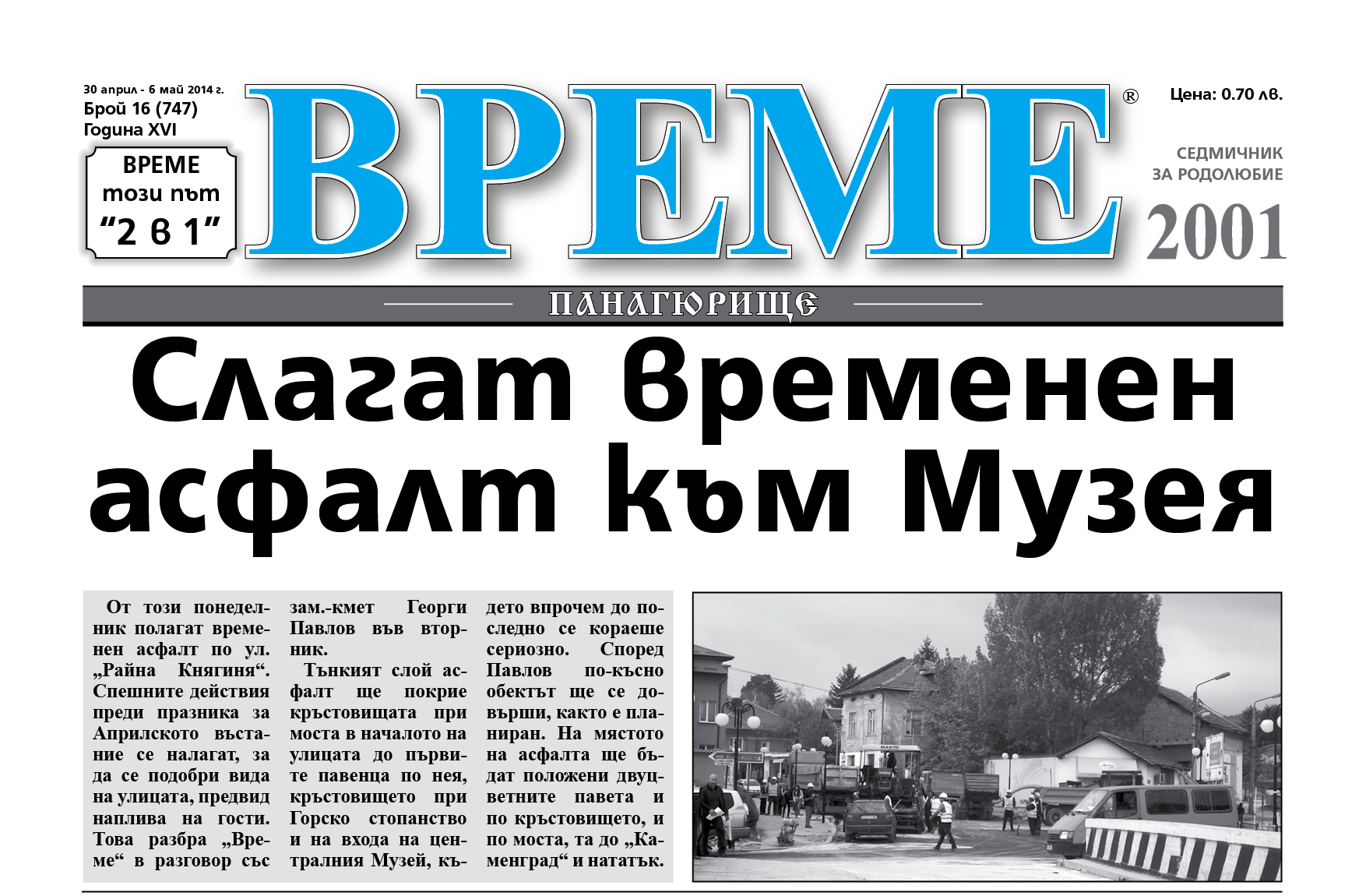 Защо решиха да асфалтират временно улицата към Златното съкровище. Как Спортният комплекс ще си има две състезателни зали. Какви са предпразничните дни в Панагюрище. Това и още какво ли не в новия брой на „Време“. Заедно с безплатната притурка на децата от СОУ „Нешо Бончев“ – Щъркелово гнездо“.