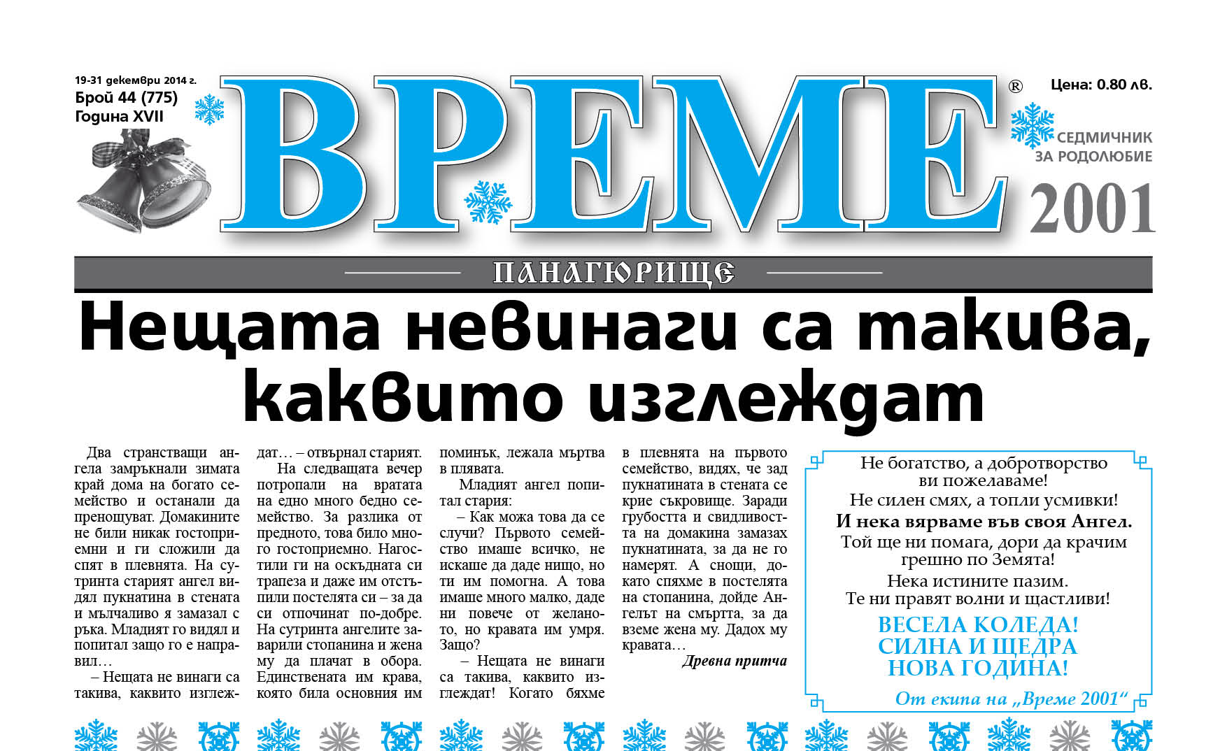 Екипът на „Време“ е много щастлив и излиза в празнична отпуска. Последният брой за годината обаче вече е на пазара. Както винаги, само във „Време“ ще прочетете топ новините от седмицата. Този път обаче сме особено празнични. Нали Коледа идва! Заедно с брой 44 вземете и нашите усмивки и пожелания за красиви Празници!