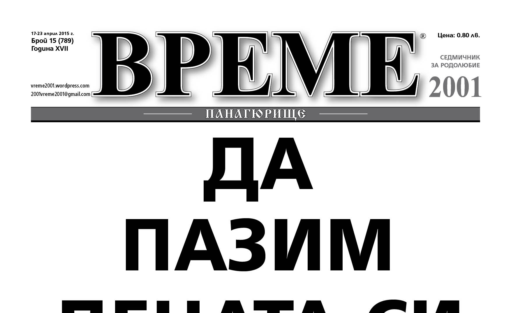 И този път си заслужава да изтичате до РЕП-а за 15 брой на „Време“. Заслужава си и още как! Само тук ще утре ще намерите: мнението на археолога за „творческите“ достроявания за разкопките, какво разказа проф. Л. Цоцорков пред младите хора, мистерията на благодатния огън, защо самодейци искат свалянето на Тасева, как полицаите се погрижиха за две козички, без да ги арестува, защо децата ходиха в съда …