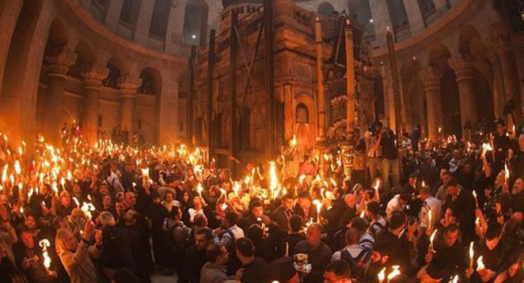 През 865 г. латинският монах Бернард пише, че „на Велика събота, в навечерието на Пасха, службата започва рано и след нейния край се пее „Господи, помилуй“, докато всички лампади над Гроба Господен се запалят с пришествието на Ангел“.