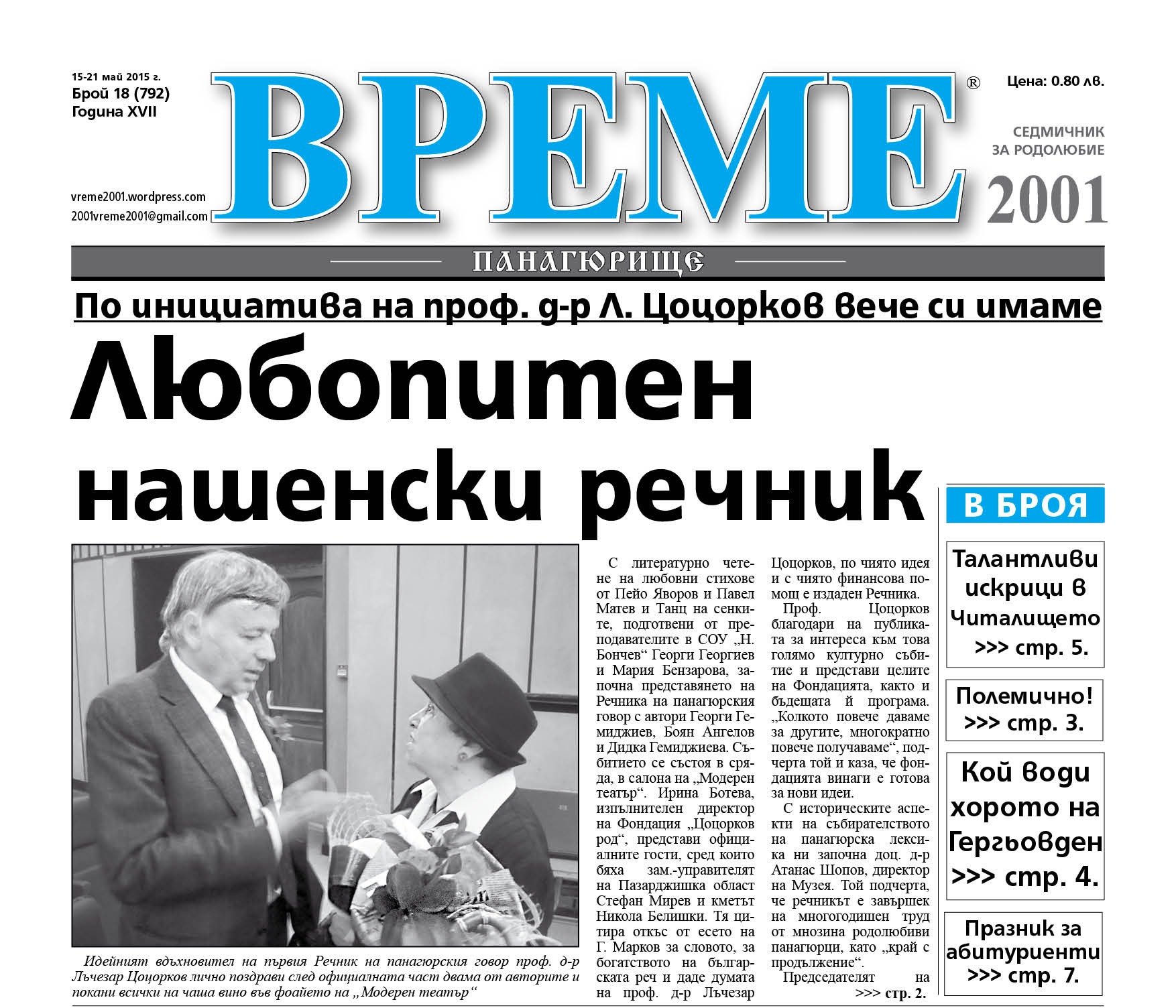 Как говори панагюрецът? Ще прочетете в Речник на панагюрския говор. Всичко за представянето на това културно събитие, ще прочетете във „Време“. Серия други културни събития намират също достойно място на страниците на вестника в неговия 18 брой.
