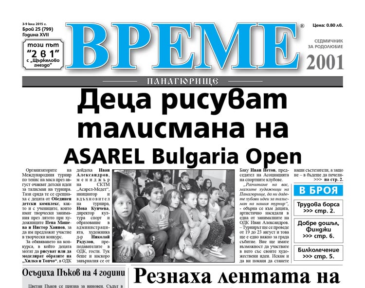 В новия брой 25 ще прочетете за 02.07.2015 · by ВРЕМЕ · в В новия брой. · Какво и как се лекува с билките пелин, овчарска торбичка и невен? Как мина авторският концерт на Стоян Финджиков в Панагюрище. Кой и как резна лентата на пречиствателната. Какво си пожелава новият Прокурор. „Време“ – вчера, днес и завинаги! Оценяване:Сподели това: Споделяне във Facebook(Отваря се в нов прозорец) Facebook Click to share on X(Отваря се в нов прозорец) X Натиснете, за да споделите в LinkedIn(Отваря се в нов прозорец) LinkedIn Щракнете за споделяне в WhatsApp (Отваря се в нов прозорец) WhatsApp Натиснете, за да отпечатате(Отваря се в нов прозорец) Отпечатване Натисни, за да изпратиш по и-мейл(Отваря се в нов прозорец) Имейл Click to share on Telegram(Отваря се в нов прозорец) Telegram Харесвам Зареждане... Related