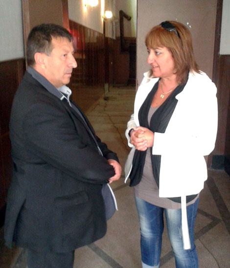 Кметът Пандуров в диалог с член на журито. Той аплодира самодейците през цялата програма на сцената и пред сградата.