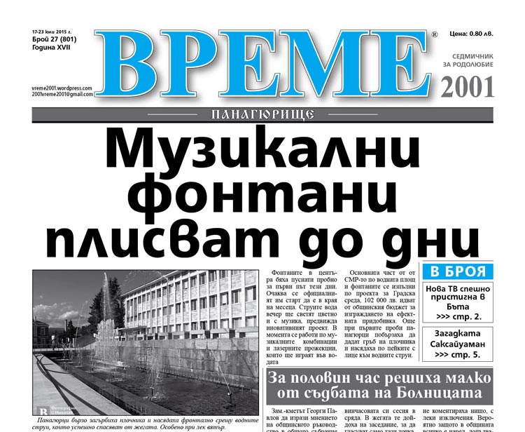 В новия брой 27 16.07.2015 · by ВРЕМЕ · в В новия брой. · Жега е! Фонтани плисват, вестници се печатат. И „Време“ е на линия с поредния си горещ летен брой. И както си знаете, като го прочете – отново ще поумнеете, а този път и ще се разхладите … Оценяване:Сподели това: Споделяне във Facebook(Отваря се в нов прозорец) Facebook Click to share on X(Отваря се в нов прозорец) X Натиснете, за да споделите в LinkedIn(Отваря се в нов прозорец) LinkedIn Щракнете за споделяне в WhatsApp (Отваря се в нов прозорец) WhatsApp Натиснете, за да отпечатате(Отваря се в нов прозорец) Отпечатване Натисни, за да изпратиш по и-мейл(Отваря се в нов прозорец) Имейл Click to share on Telegram(Отваря се в нов прозорец) Telegram Харесвам Зареждане... Related