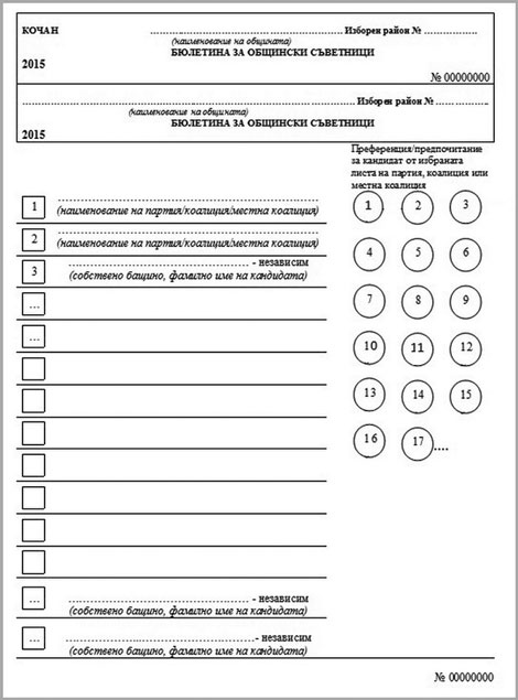 Най-отляво са номерата и имената на партиите или коалициите, които имат кандидати за съветници. Който избирател предварително има решение, трябва да запомни номера на предпочитаната листа и да я отбележи със знак V или Х.