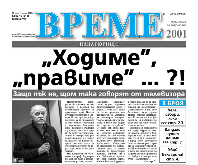В брой 40 на „Време“ ще намерите 29.10.2015 · by ВРЕМЕ · в В новия брой. · В брой 40 на вестник „Време“ ще намерите: Пишем ли и говорим ли правилно, обясни пред панагюрци проф. Владко Мурдаров; Всичко, всичко, всичко за изборите …; Случаят Поибрене! Вандалщини! Всичко това и още какво ли не само в брой 40 на „Време“. Оценяване:Сподели това: Споделяне във Facebook(Отваря се в нов прозорец) Facebook Click to share on X(Отваря се в нов прозорец) X Натиснете, за да споделите в LinkedIn(Отваря се в нов прозорец) LinkedIn Щракнете за споделяне в WhatsApp (Отваря се в нов прозорец) WhatsApp Натиснете, за да отпечатате(Отваря се в нов прозорец) Отпечатване Натисни, за да изпратиш по и-мейл(Отваря се в нов прозорец) Имейл Click to share on Telegram(Отваря се в нов прозорец) Telegram Харесвам Зареждане... Related