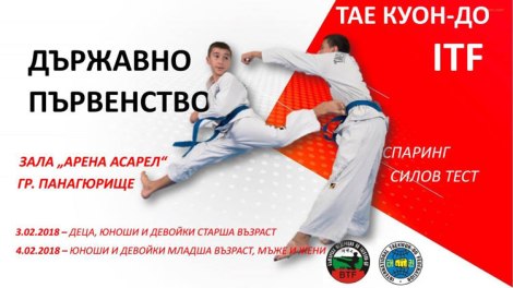 За трети пореден път Панагюрище ще бъде домакин на Държавно първенство по Таекуон-до. То ще се проведе на 3 (събота) и 4 (неделя) февруари в зала „Арена Асарел“. Дисциплините, в които ще се състезават участниците са „Спаринг“ и „Силов тест“. В съботния ден в програмата на спортния форум е предвидено участието на деца, юноши и девойки старша възраст, а в неделния – юноши и девойки младша възраст, мъже и жени.