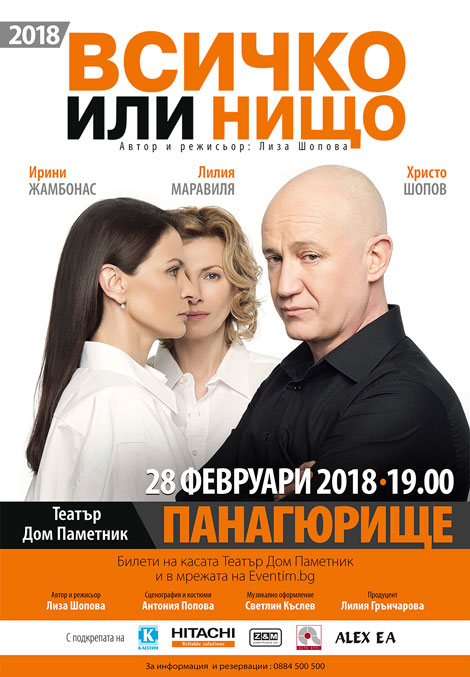 Пиесата „Всичко или нищо” с Христо Шопов, Лилия Маравиля и Ирини Жамбонас ще гостува в Панагюрище следващата сряда, 28 февруари. Началният час е 19,00, а мястото – голямата зала на Театъра Дом-паметник.
