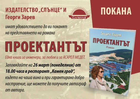 Идния понеделник, 26 март, в ресторанта на хотел „Каменград“ ще се състои представянето на романа „Проектантът“ на Георги Зарев.