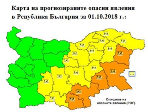Министерство на вътрешните работи, Главна дирекция „Пожарна безопасност и защита на населението“, Регионална дирекция „Пожарна безопасност и защита на населението“ – Пазарджик уведомяват, че за 01.10.2018 година е обявен жълт код за област Пазарджик за интензивни валежи, придружени със силен югоизточен вятър.