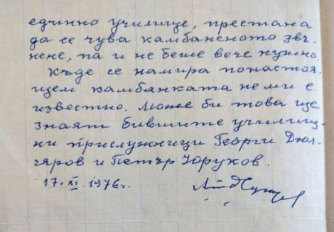 Къде се намира понастоящем камбанката не ми е известно. Може би това ще знаят бившите училищни прислужници Георги Дюлгяров и Петър Юруков.”