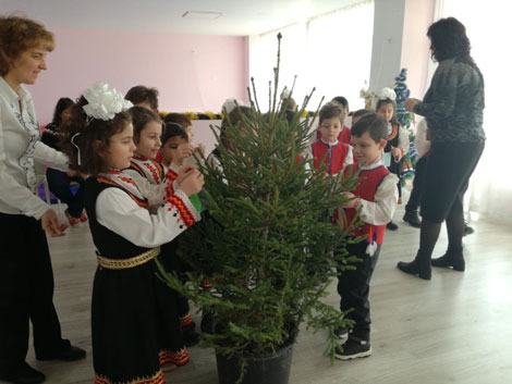 Тази седмица децата от подготвителната група „Малката русалка“ с учителките К. Велева и П. Тонева и директорът Т. Костадинова посетиха по един много специален начин децата от Дневен център „Дъга“. Малчуганите изнесоха празнична програма и окичиха празнична елха с картички, надписани с пожелания, и сувенири, изработени от самите тях. Здраве, късмет, надежда и обич пожелаха те на децата от „Дъга“ със стихове и песни. После им поднесоха огромна кошница с ябълки.