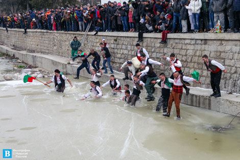 За пета поредна година млади панагюрци се потопиха в ледените води на Луда Яна, за да участват в ритуала по хващането на Богоявленския кръст. Сърцатите младежи, участващи в ритуала тази година, бяха около 20. Те не пропуснаха и да извият мъжко хоро, въпреки ниските температури.