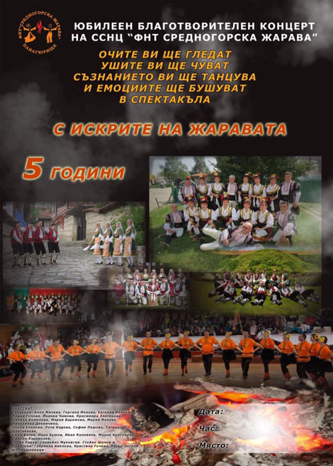 Утре вечер, 19 юни, танцьорите от ССНЦ „ФНТ Средногорска жарава“ ще представят своя благотворителен танцов спектакъл „С искрите на жаравата“. Събитието ще се състои от 19,00 ч. в голямата зала на Театъра Дом-паметник и е посветено на 5-годишнината от създаването на танцовия състав.