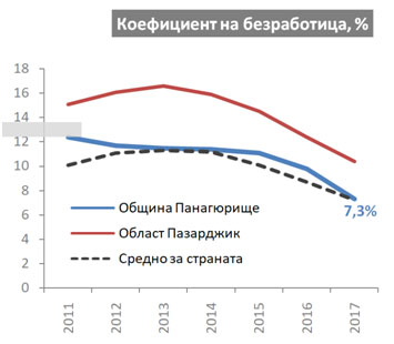 Много положителни за общината са и данните за безработицата. През 2017 г. гоним средните за страната нива със 7.3 %, за разлика от областта (виж графиката). Икономическата активност на населението в Панагюрище е с 5% по-висока от тази на областта.