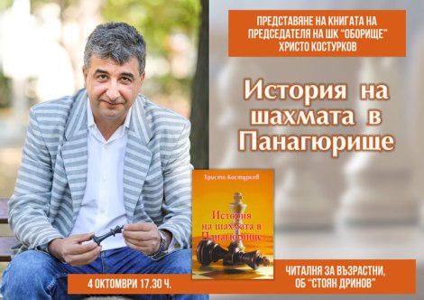 Книгата „История на шахмата в Панагюрище“ ще бъде представена този петък, 4 октомври., от 17,30 ч. в Общинска библиотека „Стоян Дринов“. Автор на новото издание е председателят на Шахматен клуб „Оборище“ Христо Костурков.
