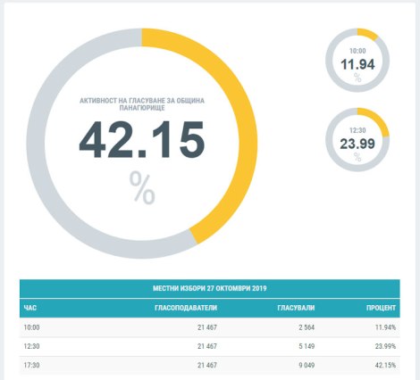 В община Панагюрище към 17,30 ч. са били гласували 42,15 % от имащите право на глас. Това означава, че общо 9 049 жители на общината са отишли до местата за гласуване.