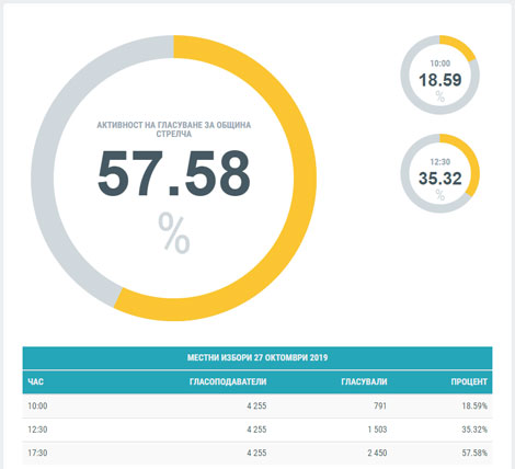 Към същия час в съседната ни община Стрелча са били осезателно по-активни. Там правото си на глас са упражнили 57,58 %, което се равнява на 2 450 души.