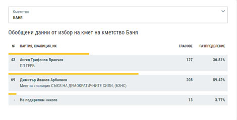 Ясни са резултатите от вота за кметове в селата в общината. В Баня с 205 гласа (59,42 %) вота печели Димитър Арбалиев издигнат от Местната коалиция СЪЮЗ НА ДЕМОКРАТИЧНИТЕ СИЛИ, (БЗНС). Другият кандидат – Ангел Вранчев издигнат от ГЕРБ има 127 гласа (36,81 %) пуснати в урните в деня на вота. Зачеркалите квадратчето „Не подкрепям никого“ са 13 или 3,77 %.