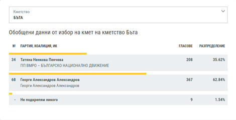 В Бъта кандидатите също бяха двама. Там най-голям процент доверие от гласоподавателите печели независимият кандидат за кмет Георги Александров – 62,84 % (367 гласа). Татяна Пенчева, издигната от ПП ВМРО – БЪЛГАРСКО НАЦИОНАЛНО ДВИЖЕНИЕ, има 35,62 % (208 гласа). Тук зачеркалите квадратчето „Не подкрепям никого“ са 9 (1,54 %).