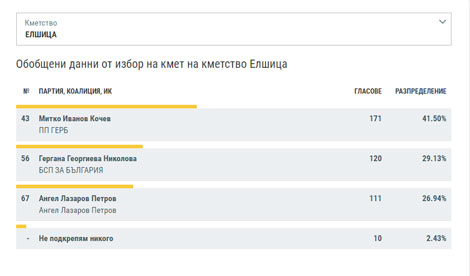 В Елшица Митко Кочев (ГЕРБ) има 41,50 % или 171 гласа от вота на жителите в селото. Втора по доверие се нарежда Гергана Николова (БСП за България) с 29,13 % (120 гласа), а трети – независимият кандидат Ангел Петров с 26,94 % (111 гласа). Отбелязалите квадратчето „Не подкрепям никого“ са 10 (2,43 %).