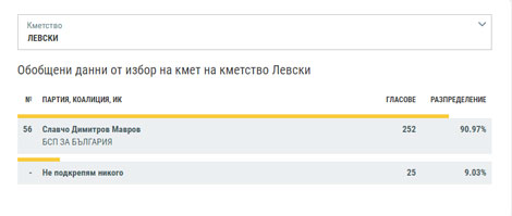 В Левски очаквано нов кмет ще е единственият кандидат за поста – Славчо Мавров (БСП за България) получил 252 гласа (90,97 %). В Левски гласувалите с „Не подкрепям никого“ са 25 (9,03 %).