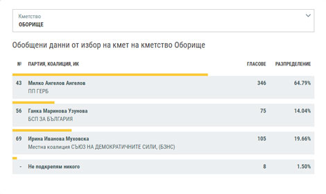 В Оборище с доста голяма преднина местния вот печели Милко Ангелов (ГЕРБ) с 64,79 % (346 гласа). За Ганка Узунова (БСП за България) са гласували 14,04 % (75 гласа), а Ирина Муховска (Местната коалиция СЪЮЗ НА ДЕМОКРАТИЧНИТЕ СИЛИ, (БЗНС)) са подкрепили 19,66 % (105 гласа). Отбелязалите квадратчето „Не подкрепям никого“ тук са 8 (1,5%).