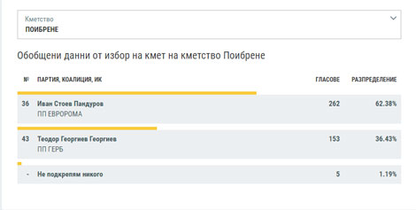 В Поибрене местния вот печели Иван Пандуров (ЕВРОРОМА) с 62,38 % (262 гласа), опонентът му Теодор Георгиев (ГЕРБ) има 36,43 % (153 гласа). В Поибрене зачеркалите квадратчето „Не подкрепям никого“ са 1,19 % (5 гласа).