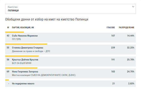 В Попинци издигнатият от ДПС кандидат за кмет Стоянка Ставрева печели 32,25 % (239 гласа) от отишлите до урните. Кандидатът на БСП за България Кръстьо Кръстев има 25,78 % (191 гласа), Нона Загорска (Местната коалиция СЪЮЗ НА ДЕМОКРАТИЧНИТЕ СИЛИ, (БЗНС)) – 24,70 % (183 гласа), Събо Марински (ГЕРБ) – 14,44 % (107 гласа). Отбелязалите квадратчето „Не подкрепям никого“ са 21 (2,83 %).