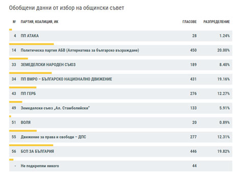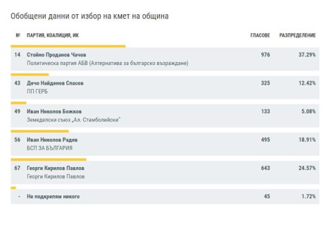 Гласоподавателите задраскали квадратчето „Не подкрепям никого“ са 45 (1,72 %).