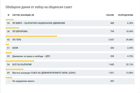 Най-голям процент доверие от гласоподавателите са получили кандидатите за общински съветници от листата на ГЕРБ – 39,88 % или 3 037 души. Втори се нареждат кандидатите от БСП за България с 22,13 %, равняващо се на 1 685 гласа. Листата на Местната коалиция СЪЮЗ НА ДЕМОКРАТИЧНИТЕ СИЛИ, (БЗНС) печели 13,80 %, или 1 051 гласували им доверие. ПП ЕВРОРОМА има 10,49 %, ПП ВМРО – БЪЛГАРСКО НАЦИОНАЛНО ДВИЖЕНИЕ – 6,30 %, ДПС – 4,70 %, ВОЛЯ – 2,69 %.