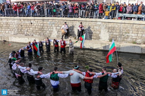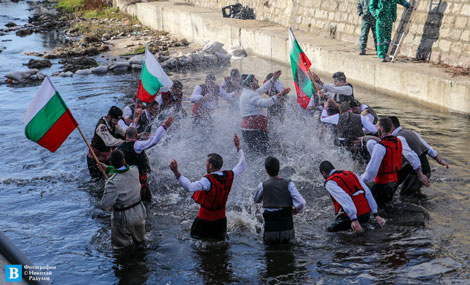 Над 20 млади панагюрци, облечени с народни носии, нагазиха водите под съпровода на гайда и тъпан, като изпълниха химна на Република България, след което заиграха своето мъжко хоро.