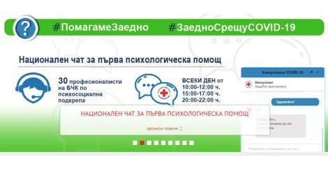 На уебсайта http://www.redcross.bg 30 специалисти по психосоциална подкрепа, всеки ден от 10:00 ч. до 12:00 ч., от 15:00 ч. до 17:00 ч. и от 20:00 ч. до 22:00 ч. предоставят безплатна и конфиденциална подкрепа на хората, които са вкъщи и имат високи нива на стрес. Всеки, който има нужда от психологическа подкрепа, може да пише в чата, а екипът отговаря в рамките на посочените часове. В останалото време всеки може да остави офлайн съобщение.