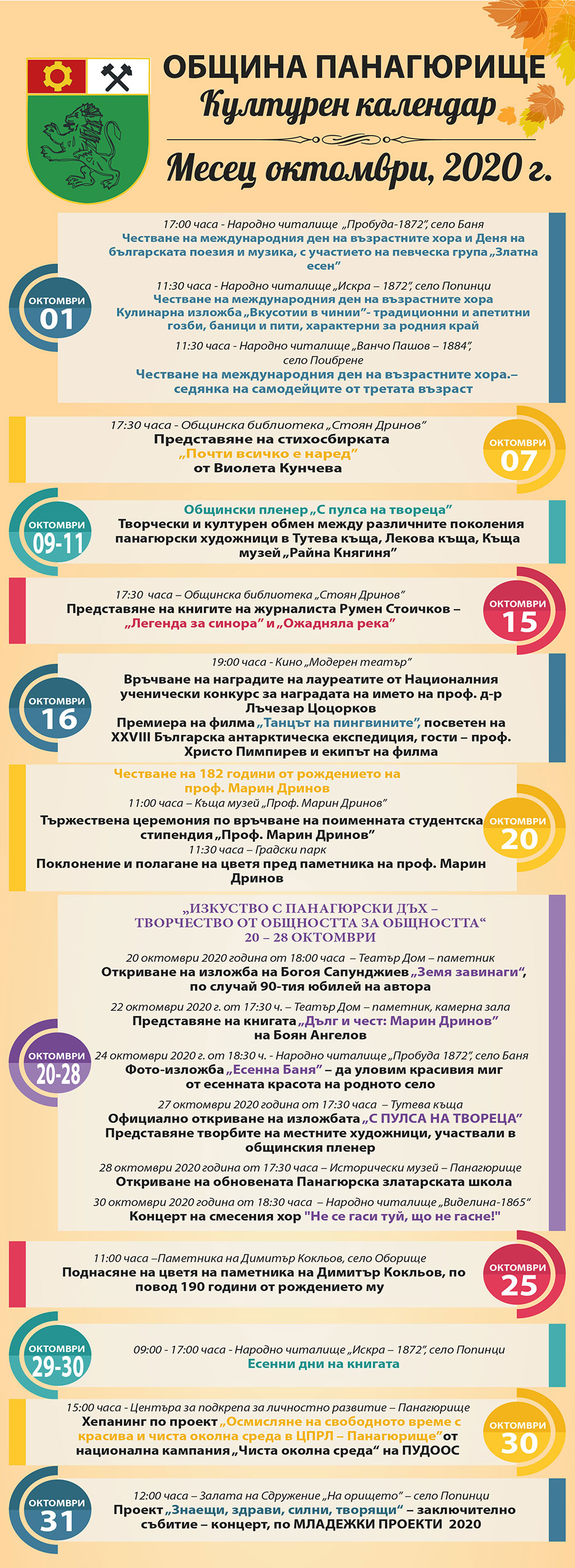 Община Панагюрище представя календар на културните събития за месец октомври, с желанието за подем на духовния живот в родния ни край.