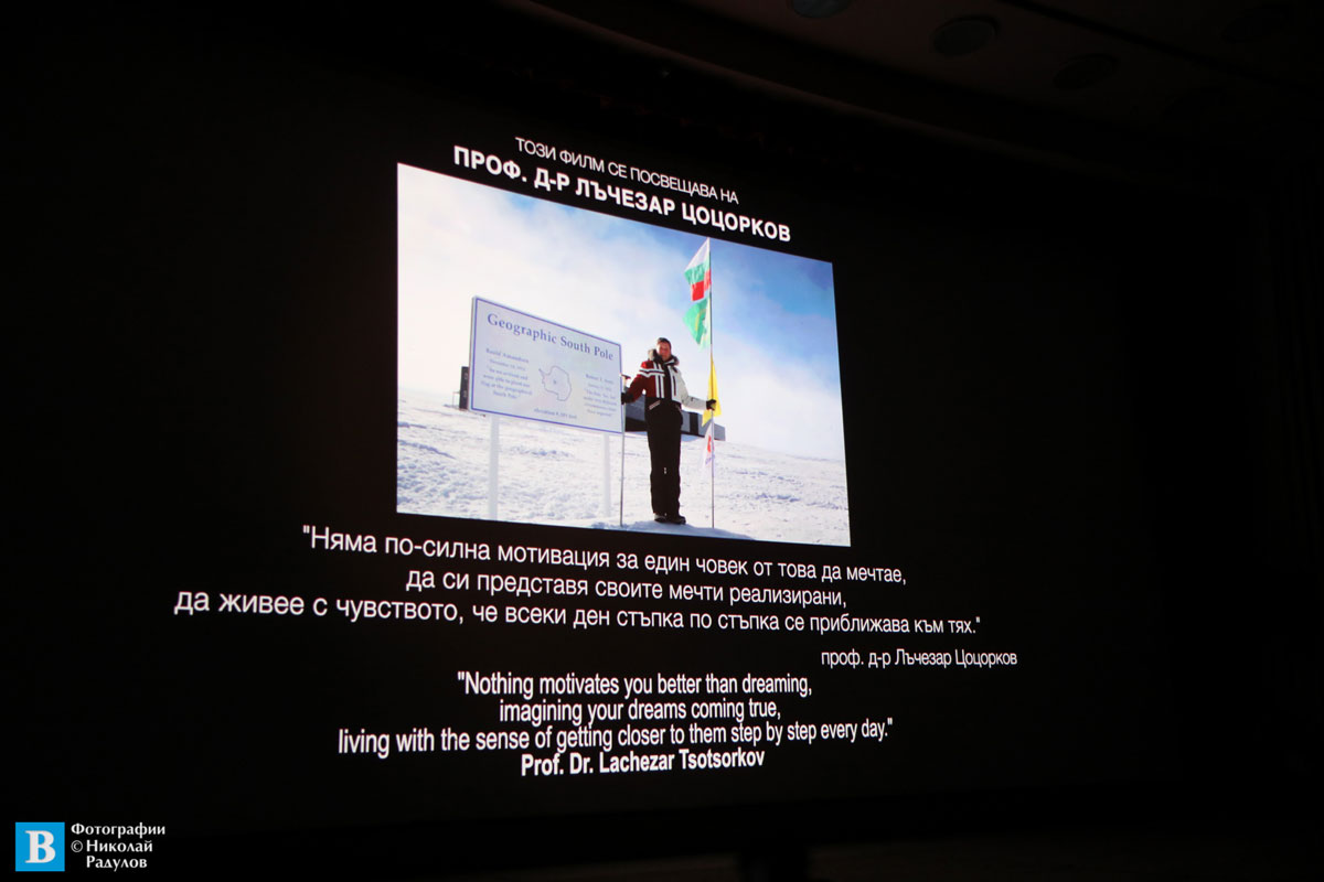 „Филмът е заснет по време на последната ни експедиция до Антарктида и решихме да го посветим на проф. Цоцорков заради подкрепата му към нас през годините. Защото благодарение на него нашата база на ледения континент премина в 21 век“, каза ръководителят на българските антарктици проф. Христо Пимпирев, който е и продуцент на филма.
