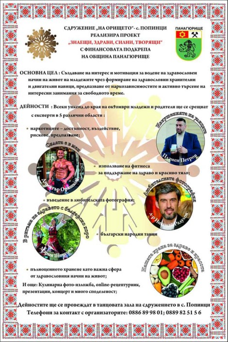 Като част от проекта „Знаещи, здрави, силни, творящи“ през неделния ден в танцовата зала на сдружението бе подредена фотоизложба с представените за участие в обявения конкурс фотографии. Те са дело на деца и младежи, участници в проекта, които имаха възможност да се включат във фото конкурса с до 2 творби във всяка от двете категории – „Пейзаж“ и „Традиции“. Ще ги оценява и класира д-р Николай Радулов, който бе и лектор в теоретико-практическия семинар, дейност по проекта.