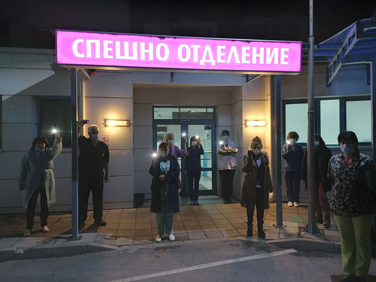 С включени светлини на линейка и фенерчетата на мобилните си телефони лекари, медицински сестри, санитари и немедицински персонал от „Уни Хоспитал“ се присъединиха към инициативата на свои колеги от страната за подкрепа на всички, които на първа линия в борбата с COVID-19.