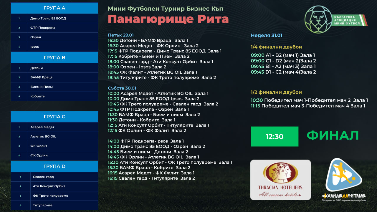 Общо 16 отбора взимат участие в третия от поредицата турнири по мини футбол „Панагюрище Рита“, който ще се проведе от днес до неделя, 31 януари, когато ще се играят финалите, а веднага след това ще се състои и церемонията по награждаването.