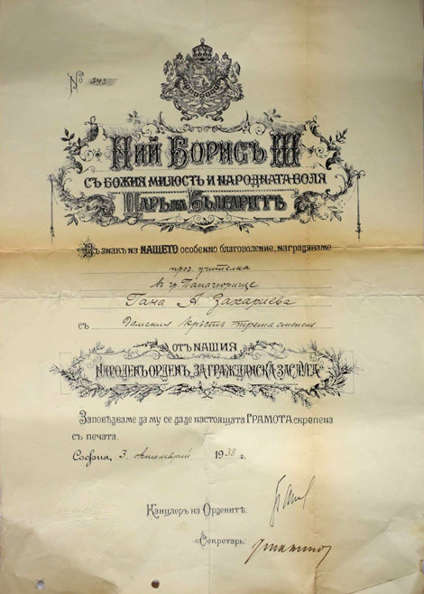 Днес, 10 март, на панагюреца Иван Захариев получи Свидетелството си за дарени за предоставения от него на Историческия ни музей през януари орден „За гражданска заслуга – Дамски кръст“ – III степен с грамота от 03.10.1938 г.