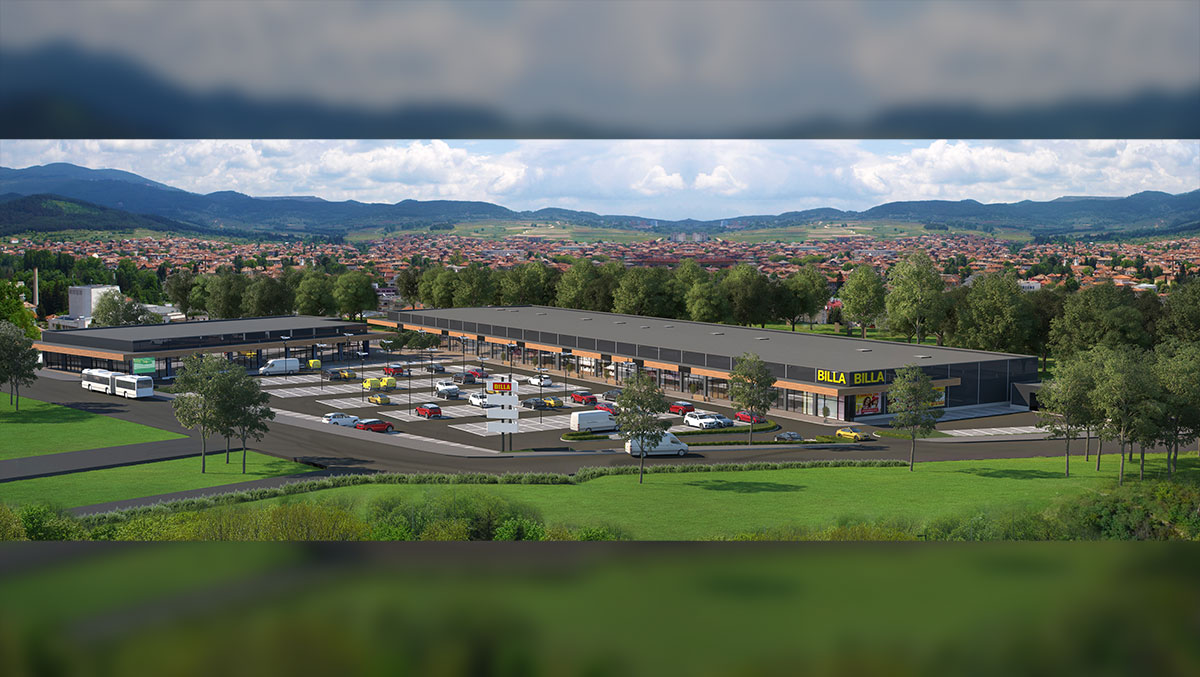 Модерният търговски комплекс ще включва магазини, заведение за хранене, паркинг и автомивка.