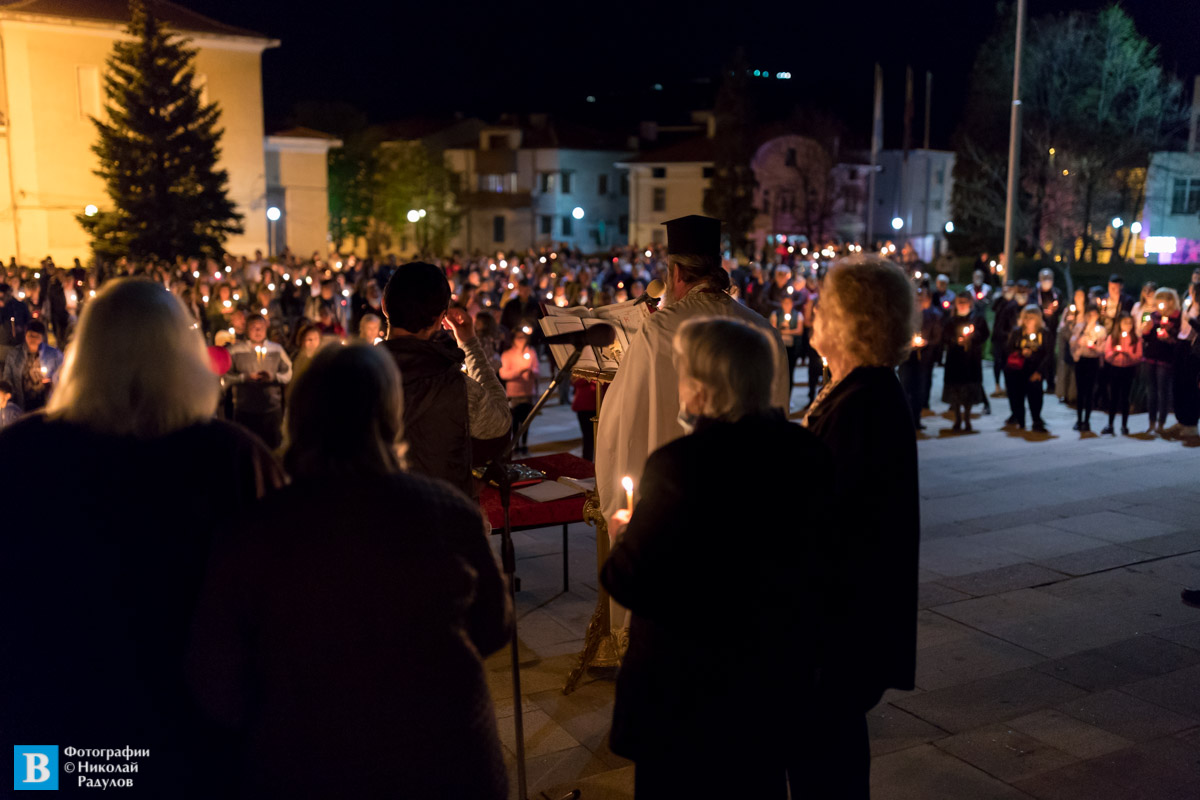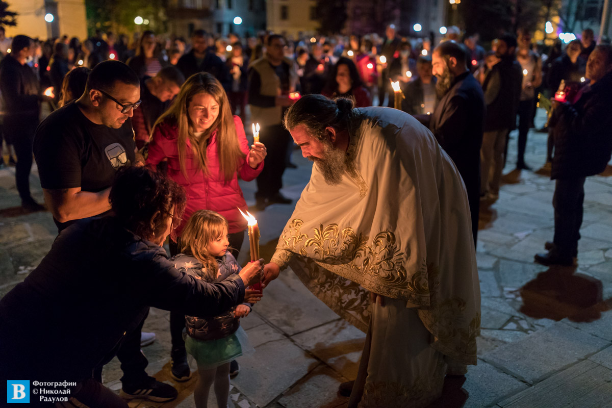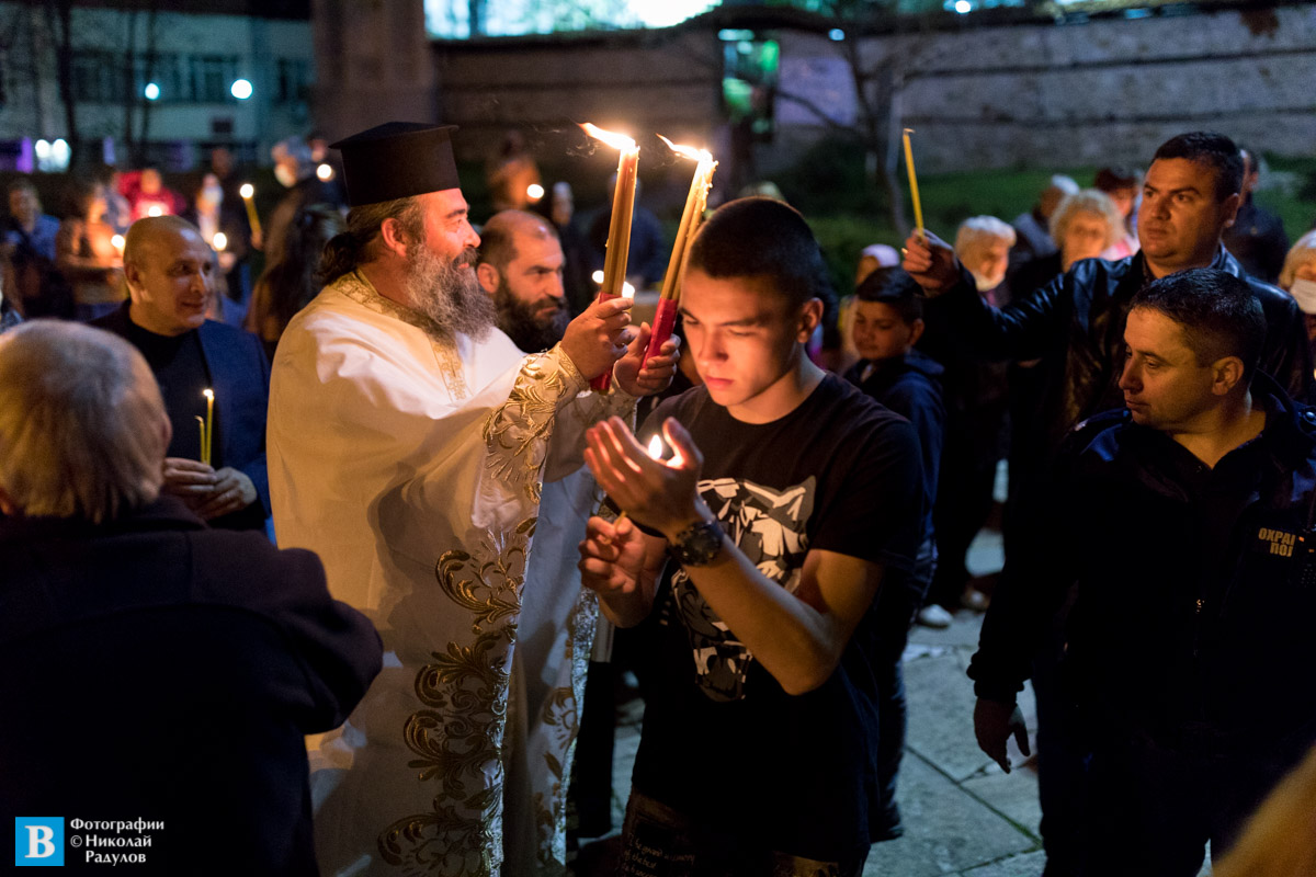 Стотици панагюрци се събраха в нощта на Възкресението пред двете панагюрци църкви – „Св. Богородица“ и „Св. Георги Победоносец“, за да бъдат част от празничното богослужение по случай най-светлия християнски празник Великден. В 12-ия част, частици от свещения огън – пристигнал няколко часа по-рано от Йерусалим, озаряваха лицата на миряните. Отец Атанас Манолов поздрави с „Христос воскресе“, а множеството в един глас отговори със „Воистина воскресе“, както повелява православната традиция.