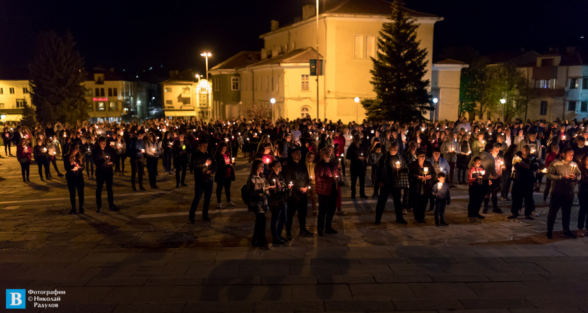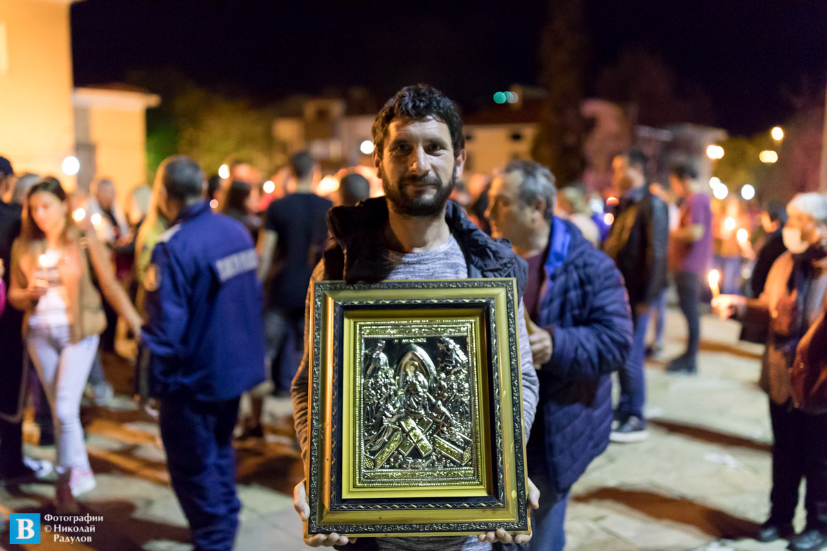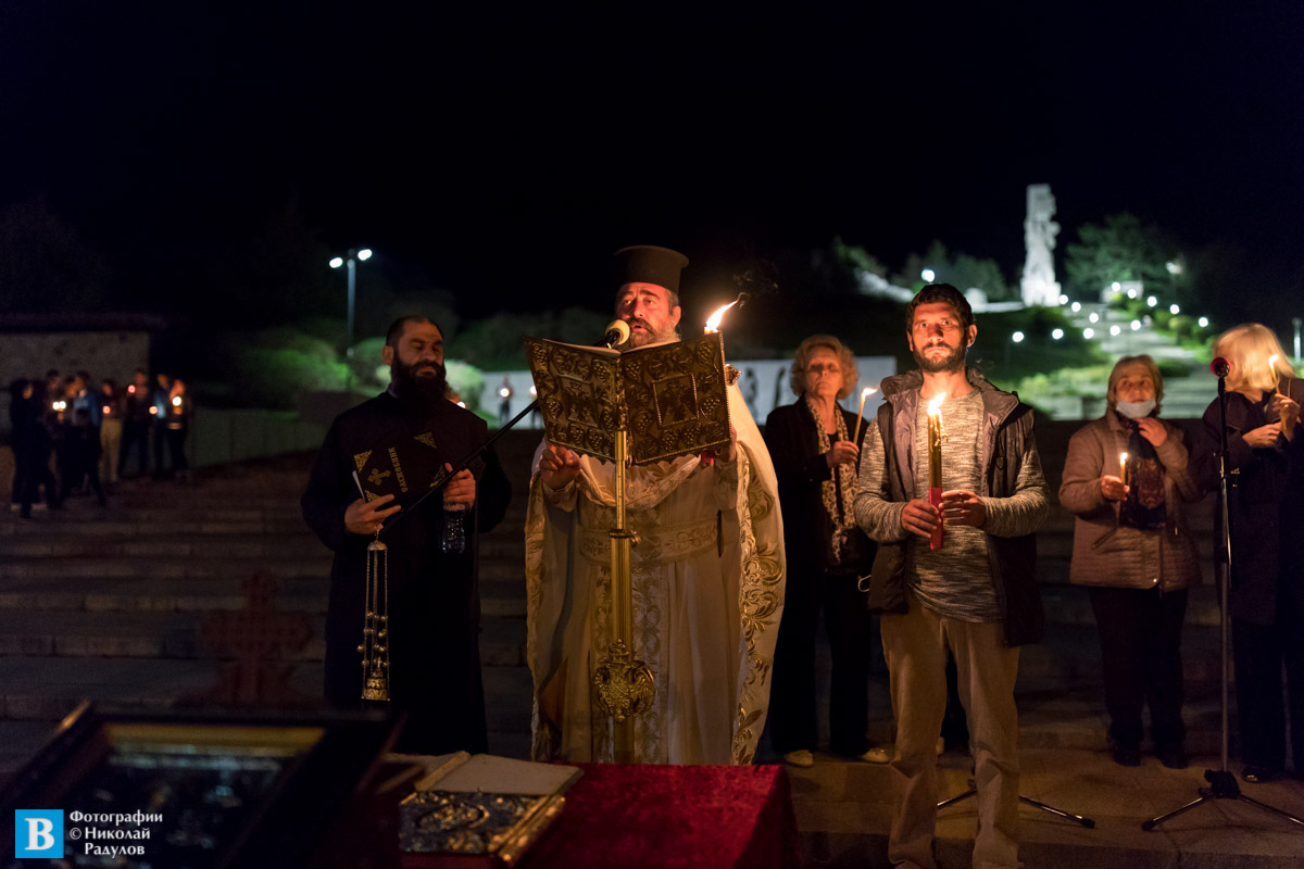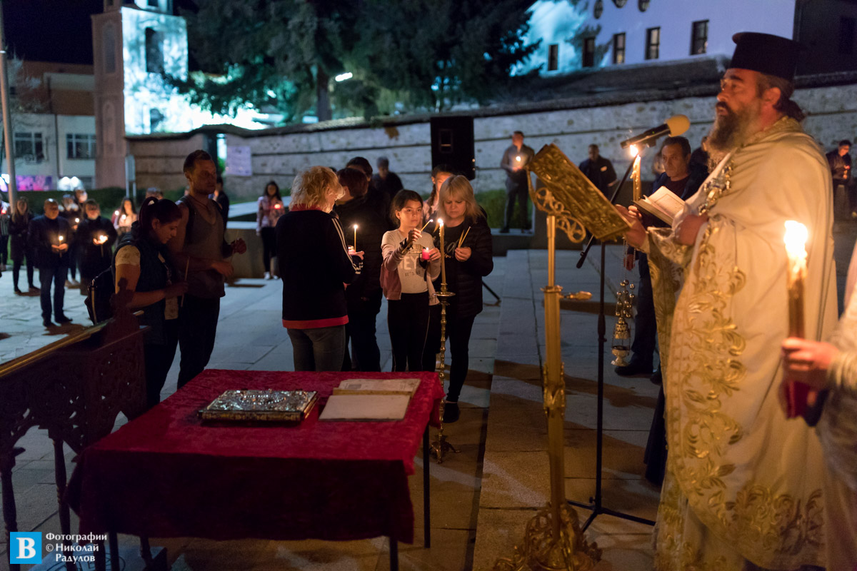 Стотици панагюрци се събраха в нощта на Възкресението пред двете панагюрци църкви – „Св. Богородица“ и „Св. Георги Победоносец“, за да бъдат част от празничното богослужение по случай най-светлия християнски празник Великден. В 12-ия част, частици от свещения огън – пристигнал няколко часа по-рано от Йерусалим, озаряваха лицата на миряните. Отец Атанас Манолов поздрави с „Христос воскресе“, а множеството в един глас отговори със „Воистина воскресе“, както повелява православната традиция.
