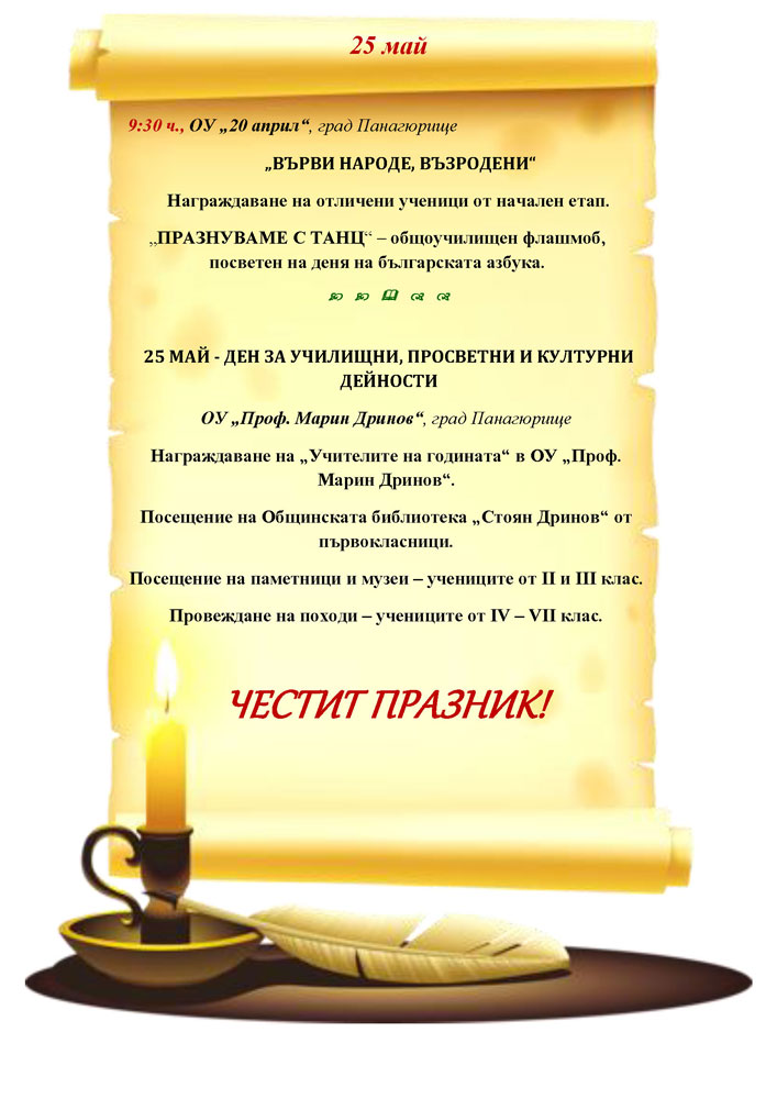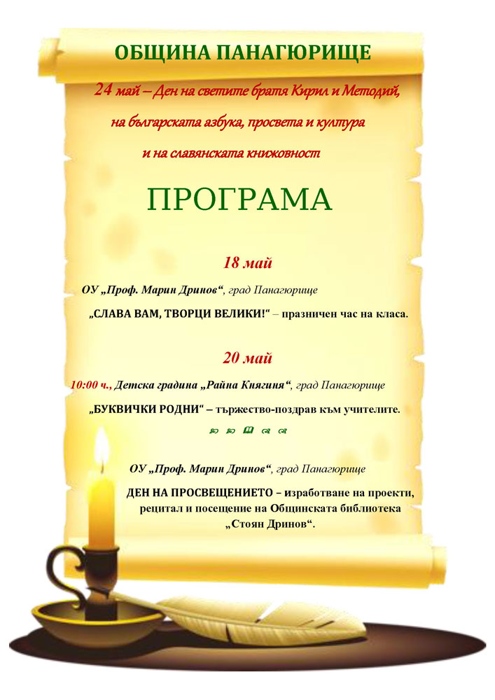 Всяка година 24 май идва с блясъка на своята тържественост, пренасящ възрожденския си дух през годините. Това е денят на буквите, на просветата, на духа! И на гордостта „че и ний сме дали нещо на света – на вси славяни книги да четат.“ В Панагюрище празникът ще бъде отбелязан с програма , в която ще вземат участие Община Панагюрище, културни и образователни институции.