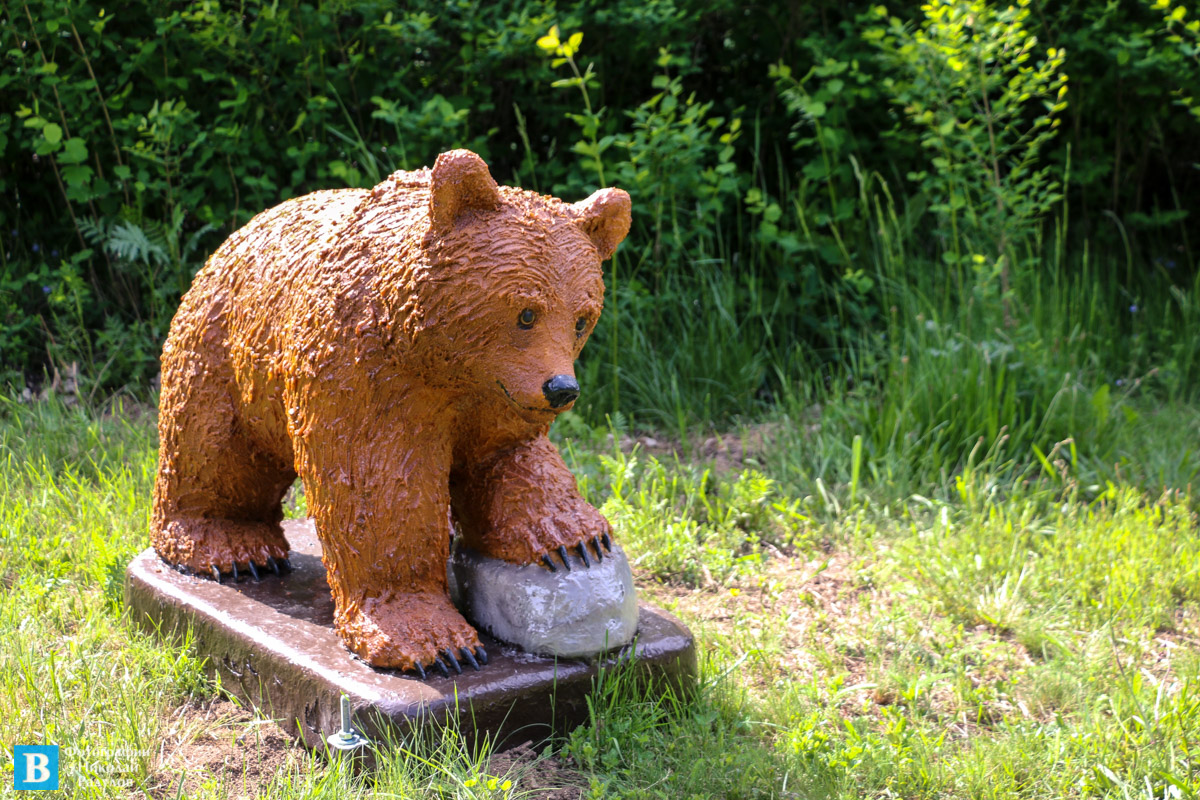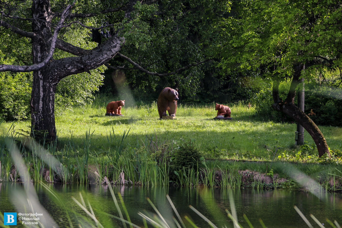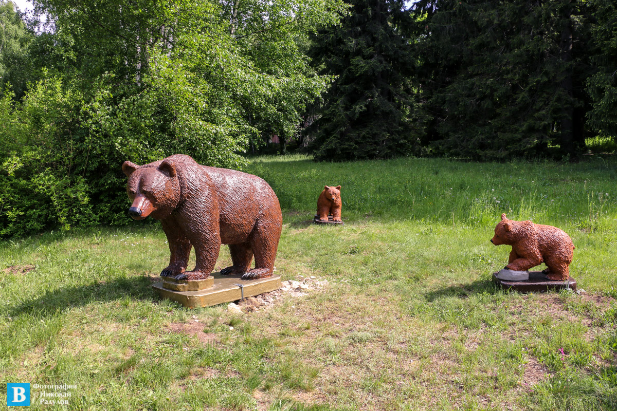 В страни от тях, в естествения екстериор на парка, се намират реалистично изработени фигури на мечка с две малки мечета, вълк и глиган.