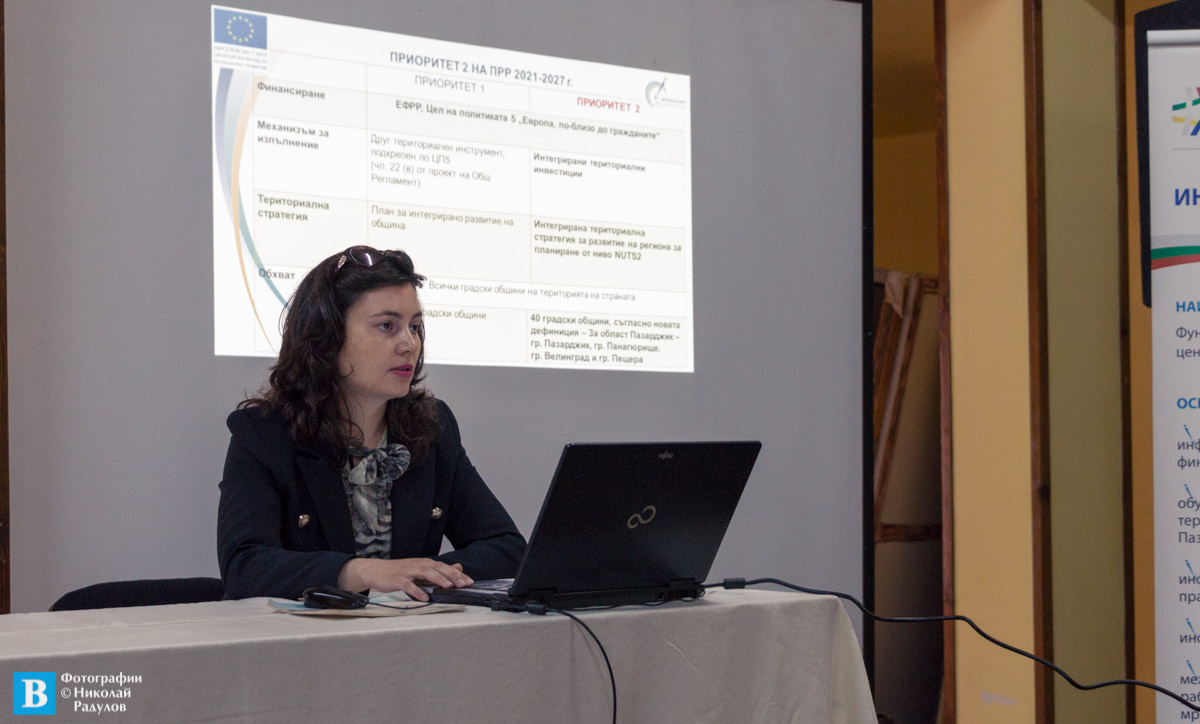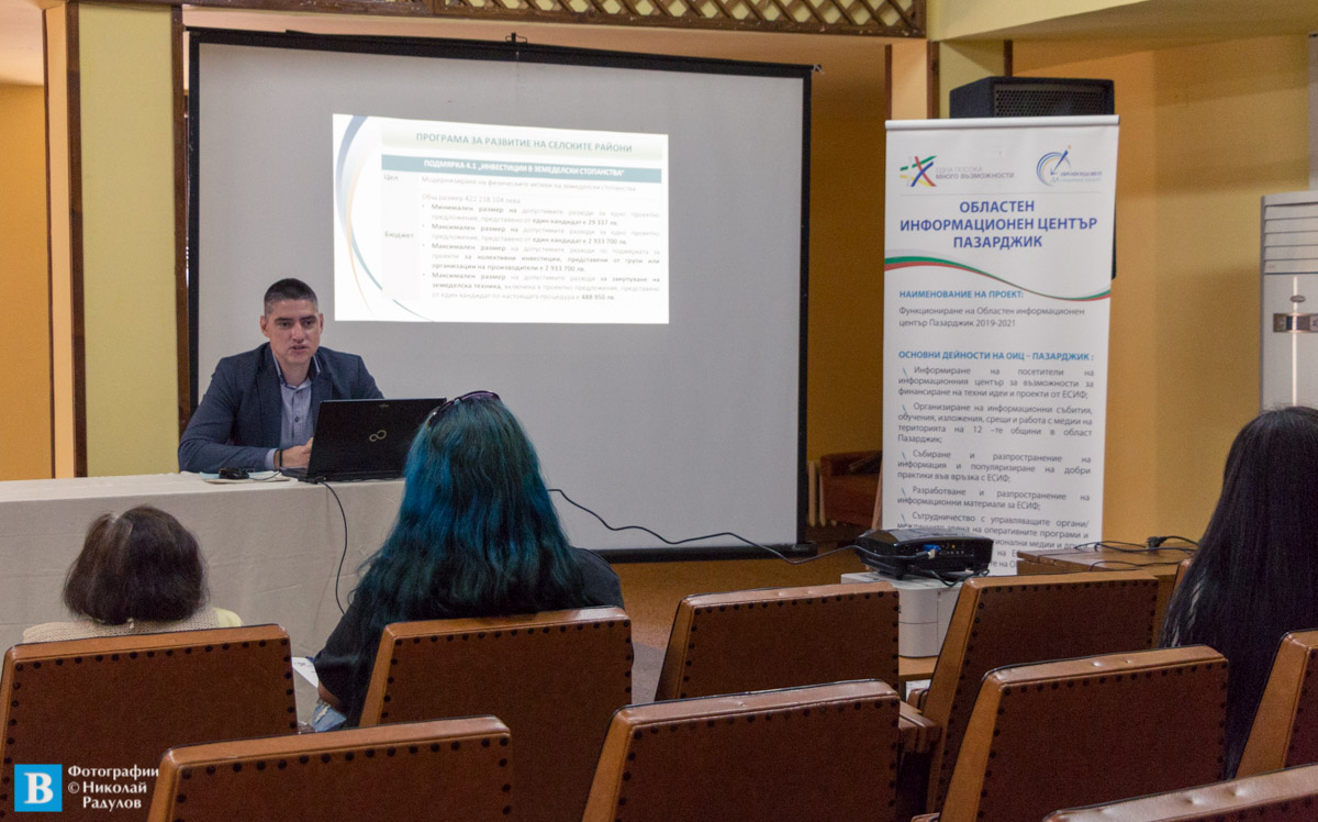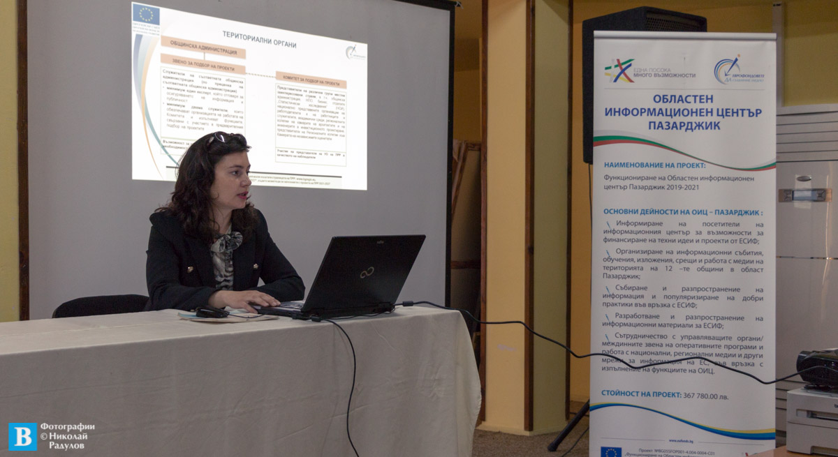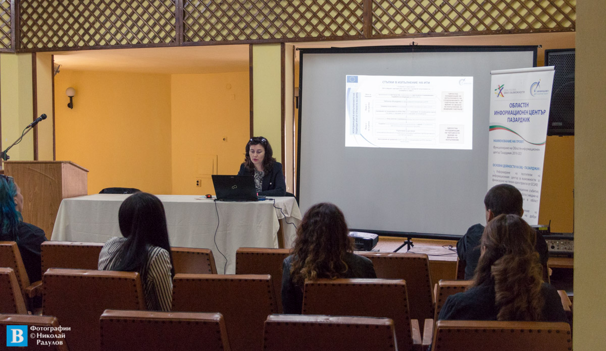 Лектори в информационната среща бяха Радослав Пешалов (управител на ОИЦ – Пазарджик) и Радина Пенкова (експерт „Комуникация, информация и логистика“).