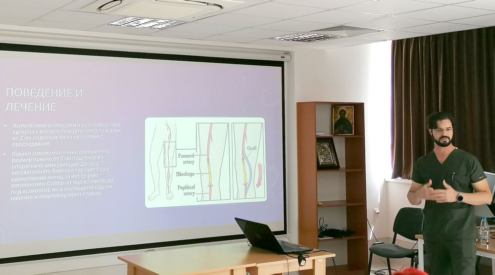 Д-р Хамуде представи клиничен случай от практиката в клиниката по съдова хирургия с началник доц. д-р Андриан Тонев, дм. Лекцията е част инициативата на лечебното заведение за повишаване квалификацията на медицинските специалисти.