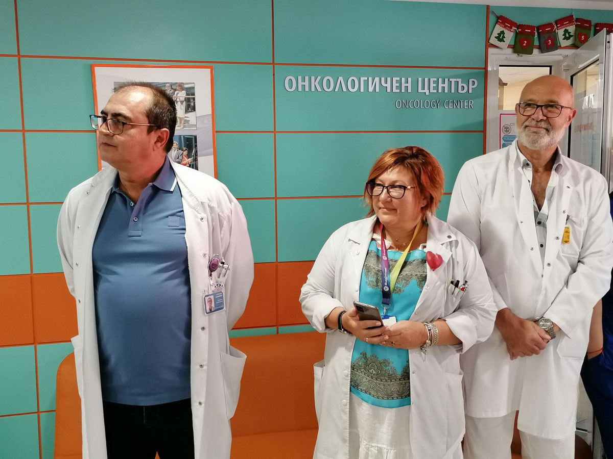 Тържествено и символично бе разрязана празничната торта – заедно го направиха д-р Кръстева, д-р Захари Захариев, началник на отделението по Лъчелечение и д-р Васил Станчев, началник на отделението по Нуклеарна Медицина.