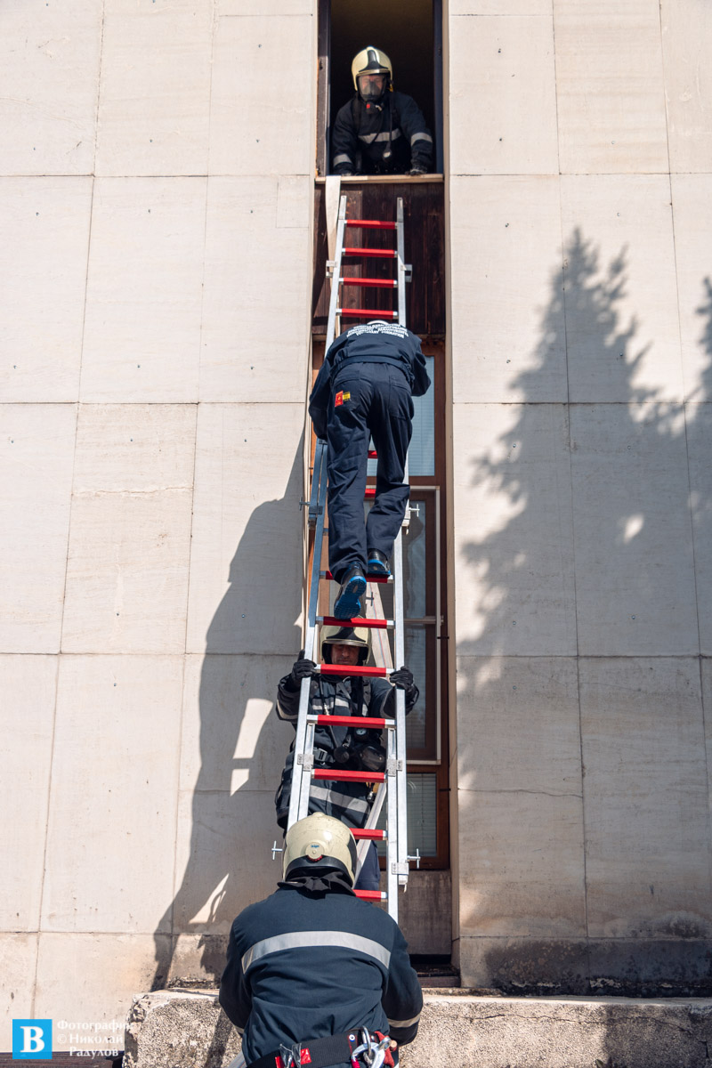 Първата част на демонстрация се проведе в Театъра Дом-паметник. Там сценарият на учението включваше извеждане на пострадал гражданин и указване на първа помощ, както и потушаване на пожар в сградата. Щом пристигнаха на мястото, пожарникарите получиха бързи указания от гл. инсп. Симеон Симеонов. Огнеборците, оборудвани с лични предпазни средства и дихателни апарати, построиха гасителни линии до „горящата” сграда. Те бързо евакуираха зрителите от сградата, като потушиха възникналия пожар.