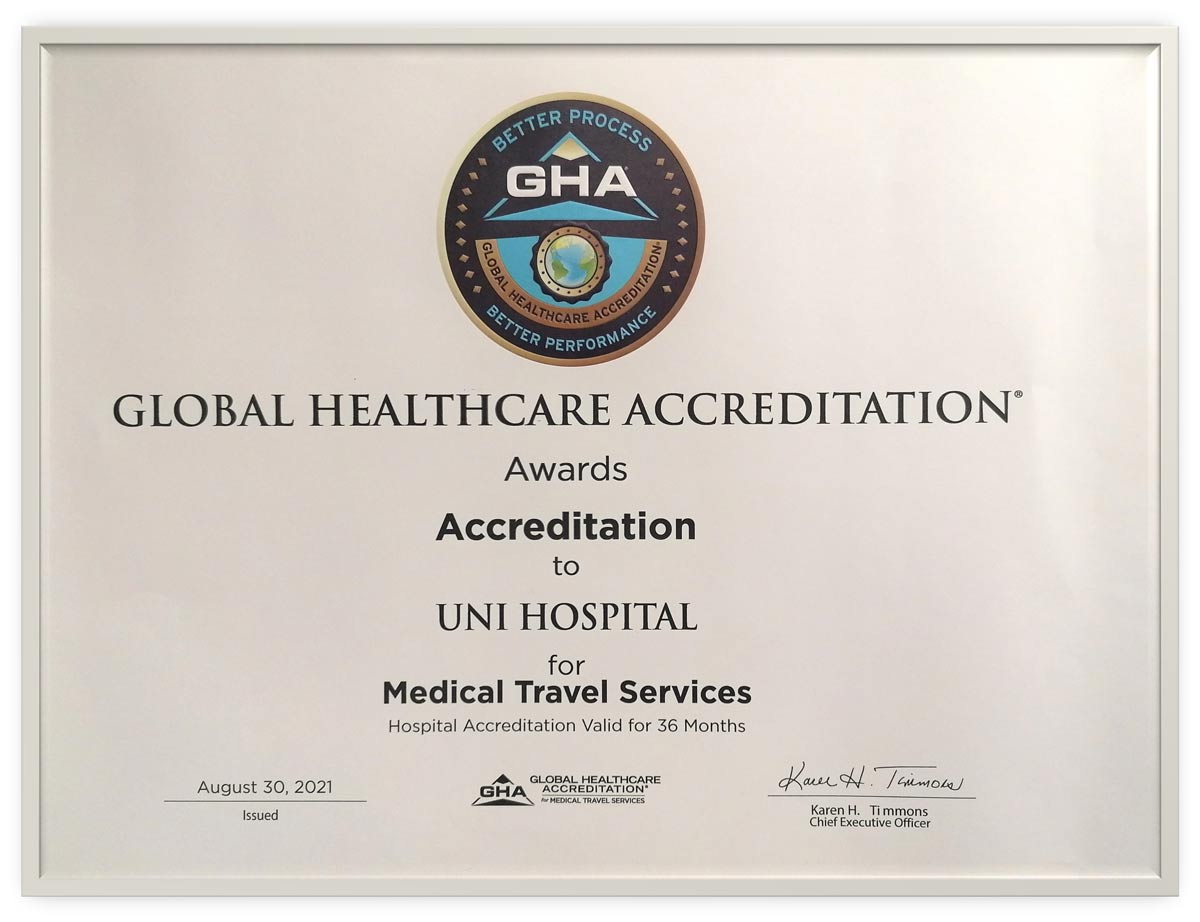 Сертификатът за акредитация, получен от МБАЛ “Уни Хоспитал“, е гаранция за изпълнението на изискванията на стандартите на GHA за безопасни и ефективни болнични грижи за пациентите, както и логистиката, свързана с тяхното пътуване. Лечението зад граница е тенденция с нарастващ ход на търсене и МБАЛ „Уни Хоспитал“ доказа възможността си да осигури на чуждестранните пациенти достъп до качествени здравни услуги в среда, която комбинира апаратура от последно поколение и висок професионален опит на медицинския персонал.